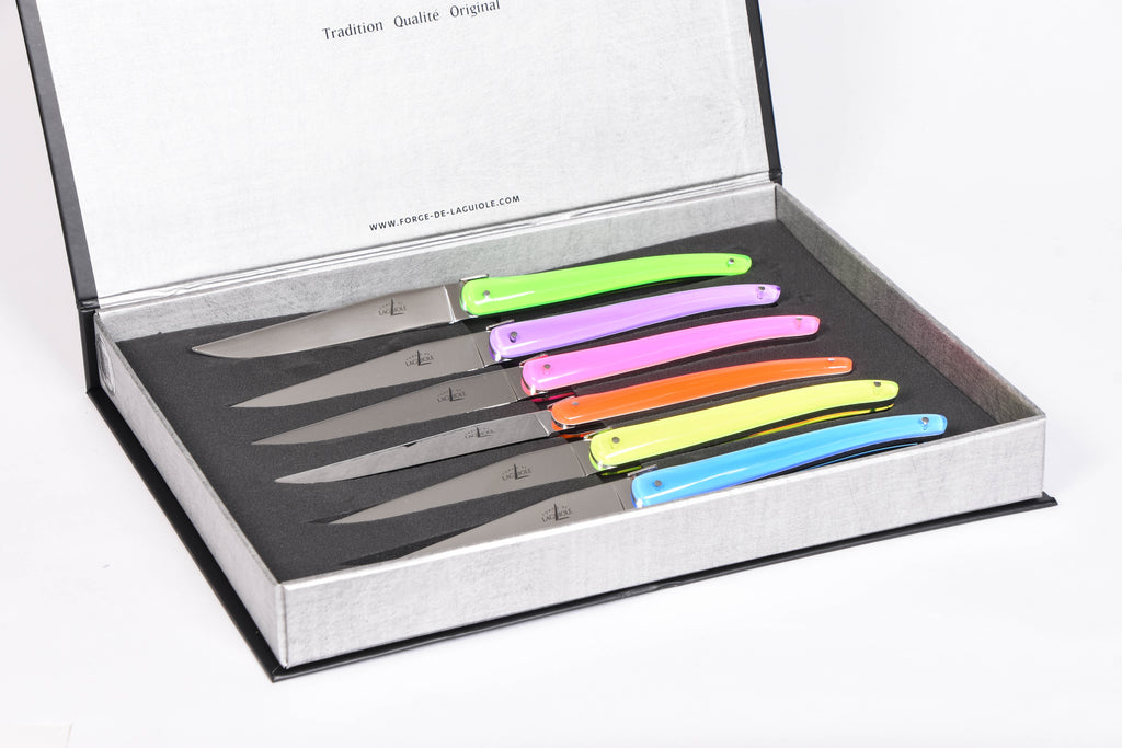 These fun set of 6 steak knives with ultra sharp blades and fluorescent handles are such fun for the table.  Sold as a set of 6.