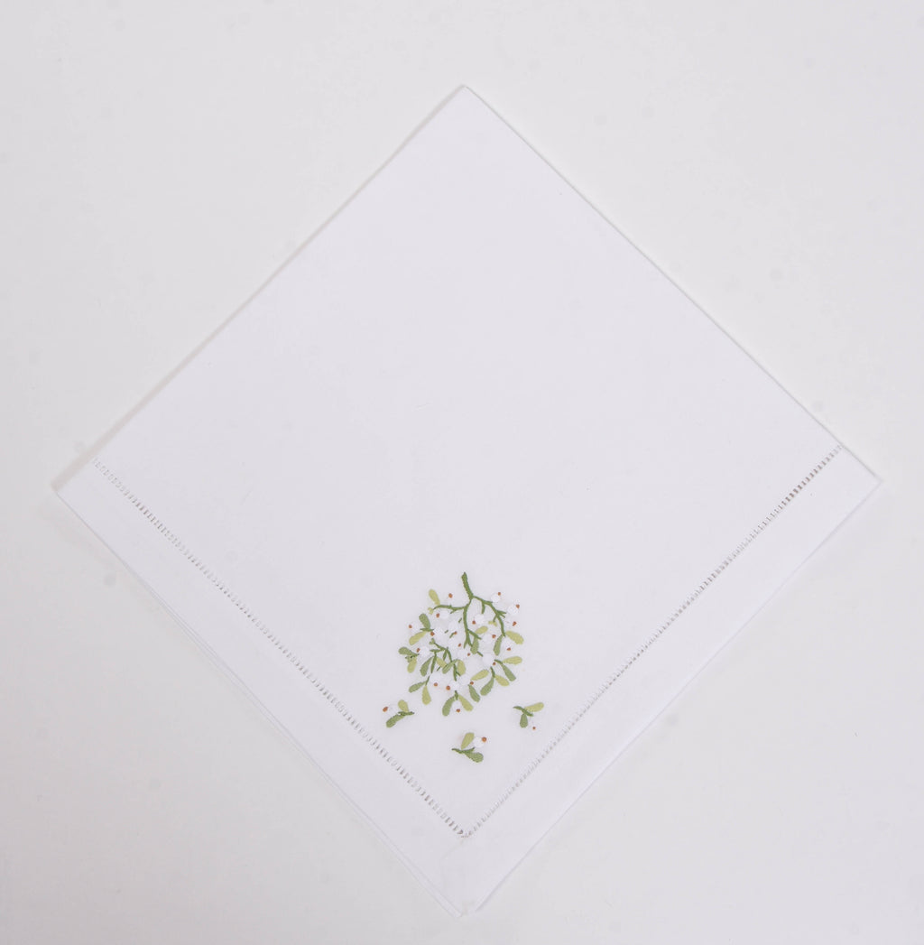 A set of 4 cotton napkins with hand embroidered Miseltoe with white berries. Fiona Finds Exclusive.